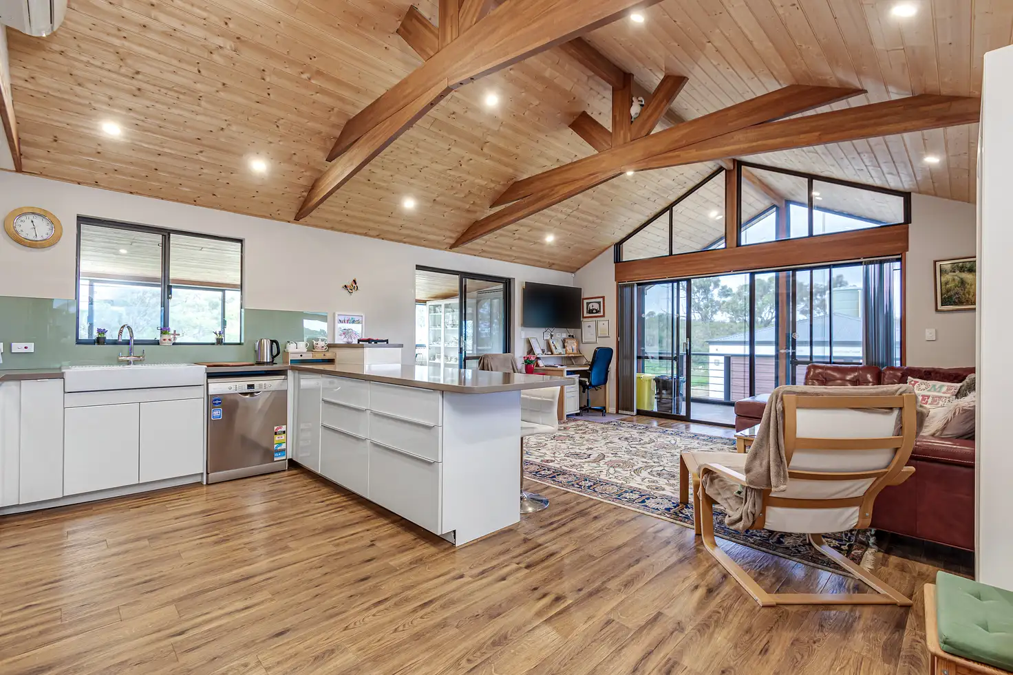 The main 5-bedroom 2-bathroom family home is as charming as it is comfortable and features a carpeted front lounge room with a burning pot-belly wood-fire heater that will keep everybody warm during those chilly mid-year winter months. It sits adjacent to a tiled dining room with access out to a delightful front verandah - where an alternative slice of the lush green vista is complemented by sounds of the resident kookaburras singing away, up in the surrounding treetops.