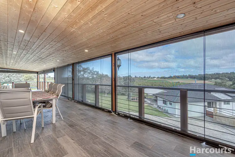The next room across is a beautifully tiled kitchen that leaves space for casual meals and impressively comprises of sparkling stone bench tops, double sinks, a five-burner Westinghouse gas cooktop, double ovens of the same brand, a 5-Star Chef range hood, a sleek, a ceiling fan and outdoor access to a huge, pitched patio, designed for covered year-round entertaining. Next to here is a fenced deck that is just perfect for a bubbling spa in the very near future, if you are that way inclined.