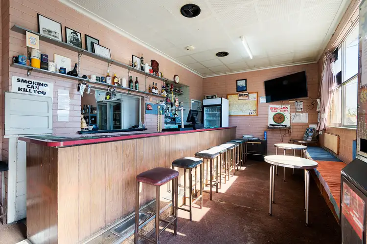The flexible floorplan features to the front a 6.9m x 3.7m bar, a store room, a cool room, and a toilet before leading to a foyer with a solid wood heater and a second toilet. Completing the 1967 part and central to the building is a north-facing kitchen, a storeroom, and two adjoining dining rooms with access to a south-facing verandah and a 7.9m x 5.9m covered outdoor entertainment area. The rear of the building makes up the original hotel and contains a living room, five bedrooms, and two bathrooms. An added section to the back provides a laundry and two separate toilets. Additional details include an integrated solar system and evaporative cooling.