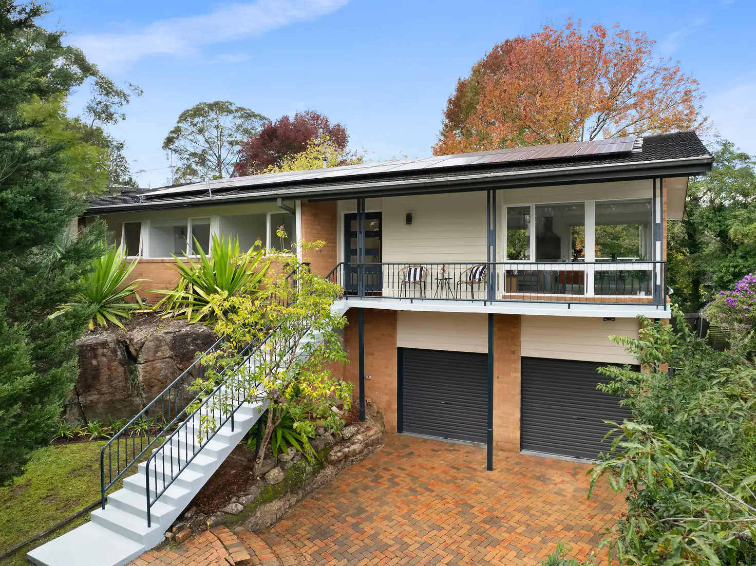 • Elevated entry to a single-level layout, light and airy interiors filled with leafy views
