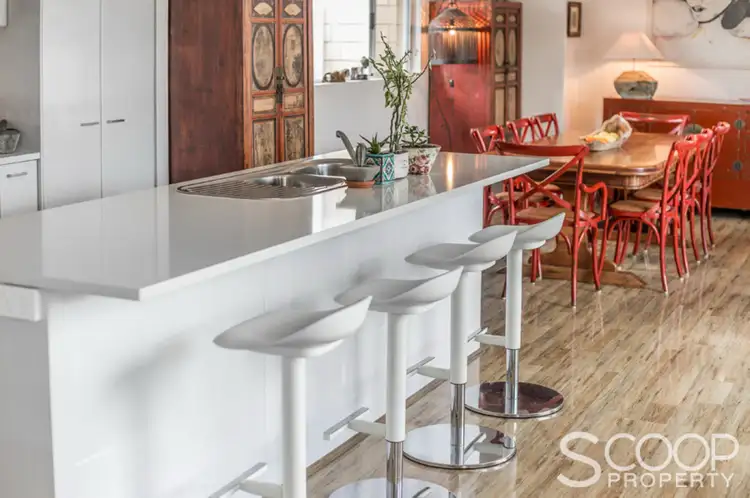 Venture down the hallway to the hub of the home, the centrally located kitchen, dining and living area. A large industrial light fitting hangs comfortably in the modern kitchen, well equipped with S/S appliances, 900mm oven, Gas cooktop, breakfast bar and ample recess for large refrigerator. A private terrace off the living and kitchen offers another space to entertain and enjoy the stunning established gardens. A lovely mix of fruit and deciduous trees, shrubs and cacti.