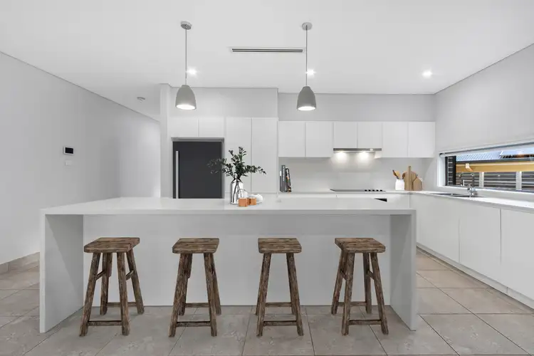 • Kitchen featuring stone benchtops, a large island with waterfall edges, an integrated dishwasher and premium Fisher & Paykel appliances, thoughtfully designed as the heart of the home