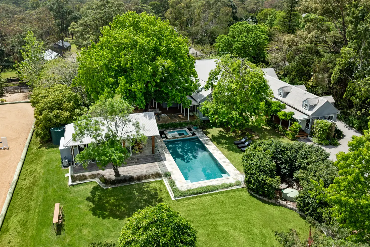 Outside, park-like grounds continue to impress, with a salt and magnesium 11m x 5m swimming pool and large spa taking pride of place in the garden. The pool is enclosed by extensive decks and entertaining areas, including an all-weather cabana complete with a full kitchen, making it perfect for effortless year-round entertaining. For equestrian enthusiasts, a full-size Olympic dressage arena is a standout feature, visible from all living areas. If desired, this space can easily be converted into a tennis court or multi-use area, offering additional recreational possibilities.