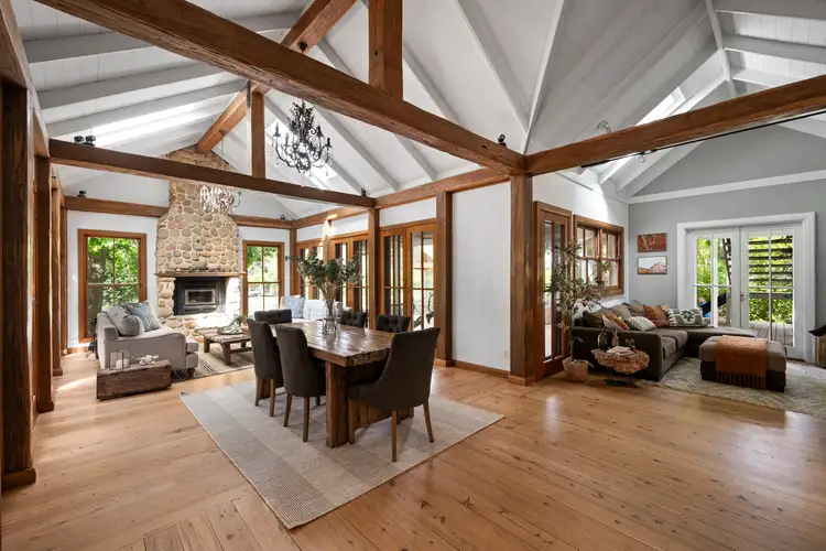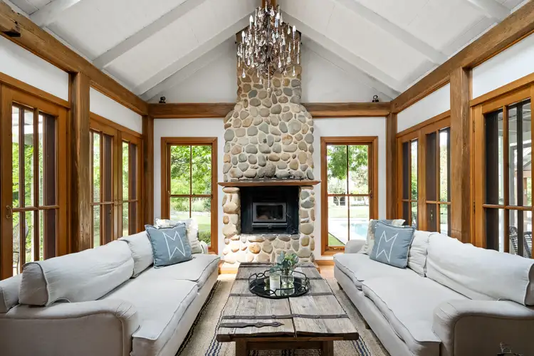 The grand lounge area is framed by sets of timber French doors and a traditional wood-burning fireplace amidst natural stone surrounds. High ceilings and natural light enhance the sense of space, while timber flooring and joinery add warmth throughout. Living, dining, family, and sitting areas blend seamlessly around the centrepiece kitchen.