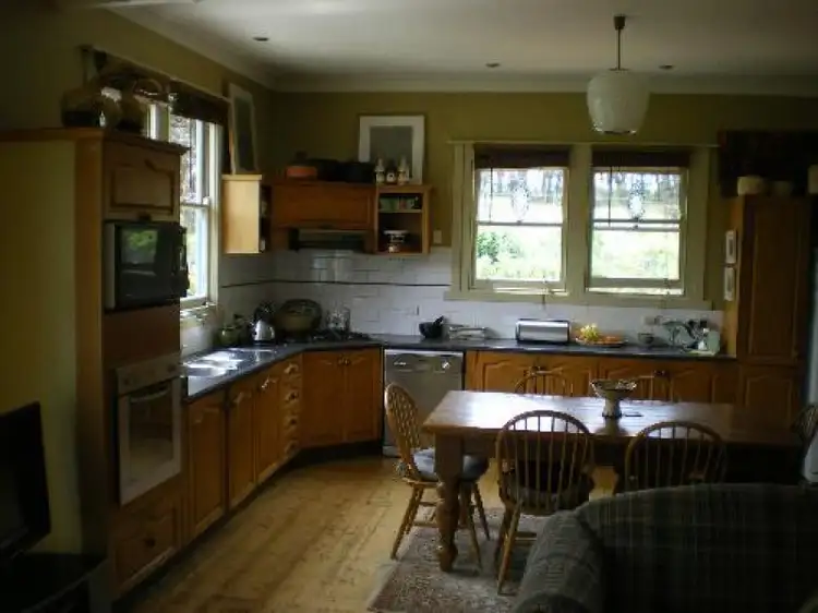 Fully insulated. Bush/garden views from all windows. Polished floor boards, leadlight windows, 2 large bedrooms (1 with BIR, bay window in main), lounge (or third large bedroom), large north-facing kitchen/living area with dishwasher, woodheater/oven, partially covered deck off living room, back lobby/entrance, central passage, utility room/laundry with 2nd toilet, bathroom with antique washstand, shower over hip bath and very large storage cupboard, separate toilet with hand-basin
