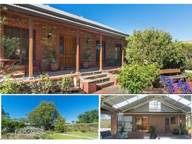 RESIDENCE: Substantial, large and character filled Kanmantoo stone fronted residence with red brick quoins and windows. The remainder of the home is constructed of rendered brick. The roof is mainly Colorbond. Many features including: an elevated, concrete and timber post, bullnose, front verandah; stained glass leadlight windows either side of the timber front door; colonial style front windows; high ceilings; tiles and new carpets. The residence has a tiled entrance area, a passage with linen press and a huge living room with a slow combustion heater on a stone hearth. This room is suitable for a lounge and formal dining if so desired. A big farm style eat-in kitchen including a family area. The kitchen is constructed of oregan timber and has numerous built-in cupboards and a pantry, gas bench hot plates and a rangehood, an electric elevated oven and a dishwasher. This room is heated by a slow combustion heater and opens to a near new, large, paved rear verandah/entertaining area. This area has a BBQ, fish pond and stone feature wall and also adjoins a gable roofed, semi open, carport area which, in addition to the large verandah, is outstanding for outdoor living / entertaining. The main bedroom is large and is serviced by a large walk in robe and an ensuite bathroom, which is fully tiled from floor to ceiling. Bedroom 2 has a door which opens to the side / front of the residence. This room is ideal to use as an office for professional use to incorporate a residential / business mix to the property if so desired (subject to any consents). Bedrooms 3 and 4 are of good proportions. The bathroom is fully tiled from floor to ceiling and includes the ‘traditional bath’, shower alcove, vanity unit and wall mirror. Laundry and separate toilet, electric HWS and ceiling insulation.