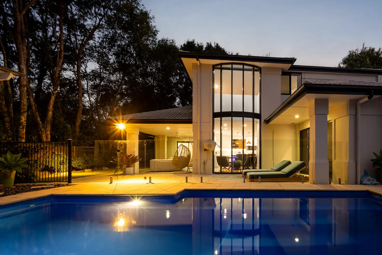 Glass-framed living zones flow seamlessly to the north-facing pool and outdoor pavilion, where lush gardens and a charming gazebo create the perfect sanctuary for sun-drenched afternoons or twilight gatherings under the stars.