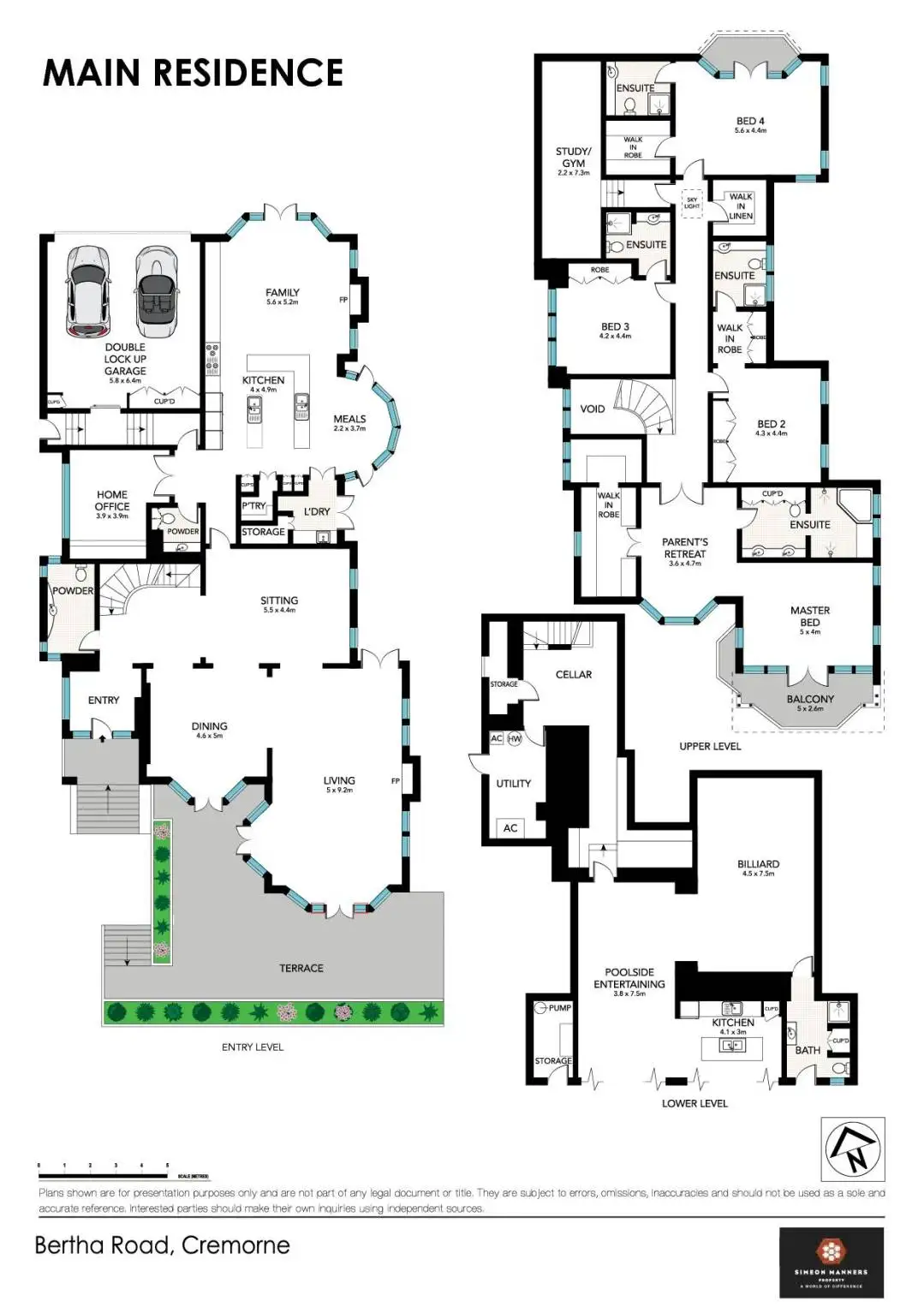 The upper level comprises 4 spacious bedrooms all with ensuites, the Master with its own parents retreat and private terrace. The huge North facing Kitchen and family area, home office and sandstone and oak wine cellar add to this wonderful floor plan.