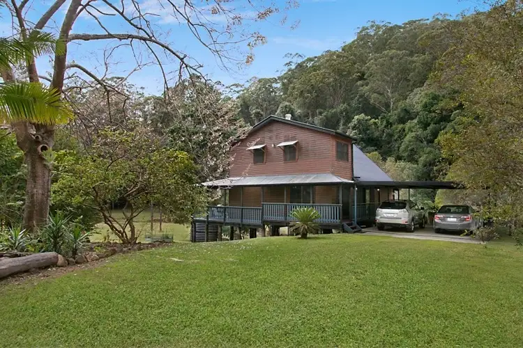Leave the bustling riverside township of Murwillumbah and follow the winding roads through the cane fields and into the rainforest to discover a private oasis. Situated alongside a bubbling creek of fresh spring water, in a lush and picturesque valley, this beautiful timber home is a vision from a storybook, with deep shady verandahs all round, offering the perfect place to watch the dawn break or wile away an afternoon. Magnificent rainforest cloaks the towering hillside just beyond and the garden is lush with flowering trees, fruiting plants and tropical undergrowth. This is the place to be, totally private and peaceful.