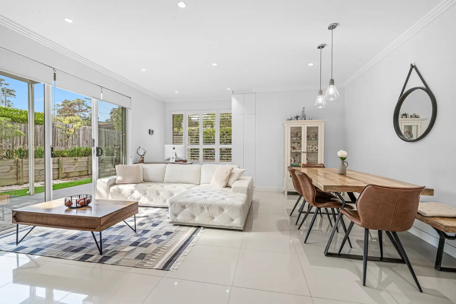 - Sunlit lounge and dining area with built-in cabinetry, study area