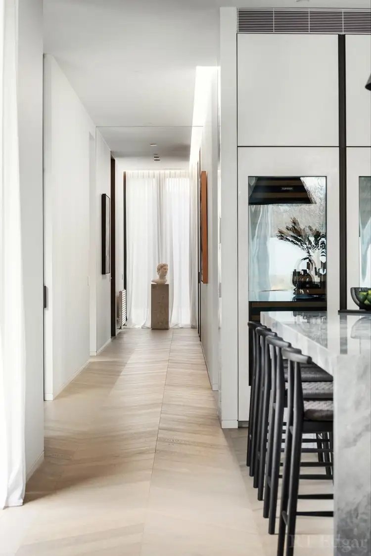 A striking presence on its premier period lined street, this leading edge building hosts just two luxuriously large residences, each securely accessed via their own private ground floor entry. Ground Residence opens to a wide entry foyer where European Oak floors lead the way to two north facing living domains full of natural light and leafy outlooks, both with landscaped entertaining terraces. Large open plan living/ dining areas include a fully fitted Subzero bar and gas fire aside a substantial gourmet kitchen featuring marble benchtops and butler’s pantry equipped with the latest in SUBZERO refrigeration with fridge, freezer, red and white wine fridges, WOLF cooking appliances including two pyrolytic ovens, combi /microwave, induction and gas cooktops, and two MIELE dishwashers. A second living domain spills out to a second terrace with WOLF BBQ adjoining a home office and executive study with storage. In their own separate zone, three bedrooms include two with robes and ensuites, the palatial main suite lavishly appointed with a large fully fitted WIR featuring twin dressing and exquisite ensuite.