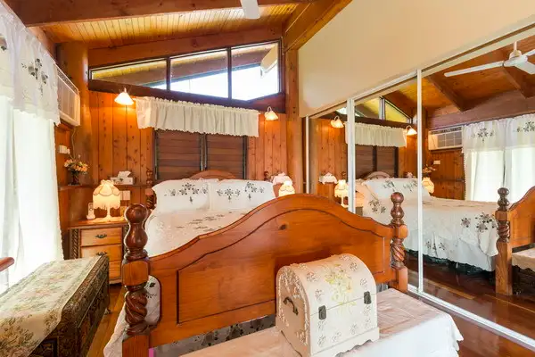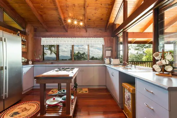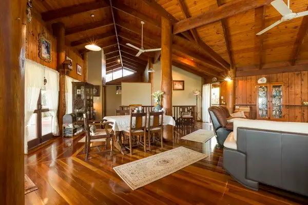 • A stunning jaw dropping pole home that sports a welcoming rustic appeal. The top storey boasts plenty of natural light streaming through from elevated glass panels and with the combination of lovely timber walls, polished timber floors and timber ceiling adding to its cosy warmth and charisma, transcending a dreamy effect of sheer calm and serenity. Upstairs also boasts two bedrooms, a bathroom and country kitchen also looking onto amazing views with a servery to a very spacious undercover deck. The main bedroom also opens up to the outdoor entertainment area.