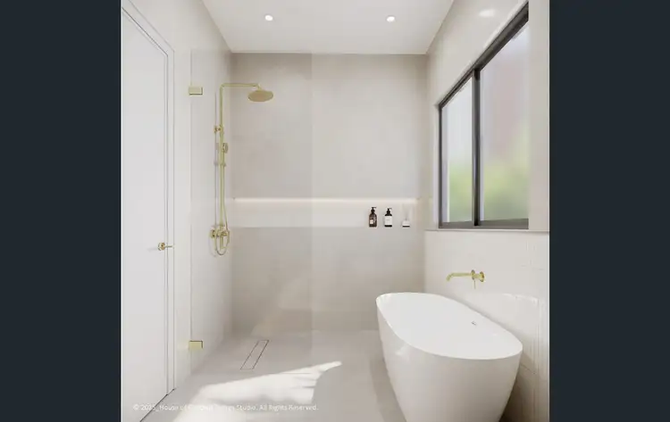 The master suite offers a private retreat with a walk-in robe, an ensuite featuring golden or gunmetal tapware, a wall mounted toilet, and a luxurious feel throughout. The three additional bedrooms all come with built-in robes, while the central bathroom impresses with its freestanding bathtub, separate shower, dual vanity, wall mounted toilet and a striking feature tile wall.