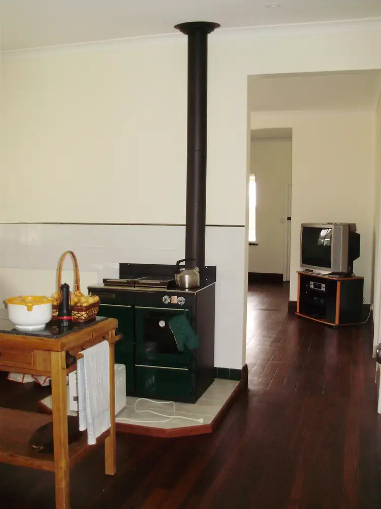 The cosy KITCHEN has a Thermolux wood stove which also warms the home, there is room for a gas stove. The laundry and bathroom cabinets are solid recycled jarrah and pine with Federation style green and cream tiles in all wet areas. Relax on the elevated front verandah and enjoy views onto farmland and water catchment dams.