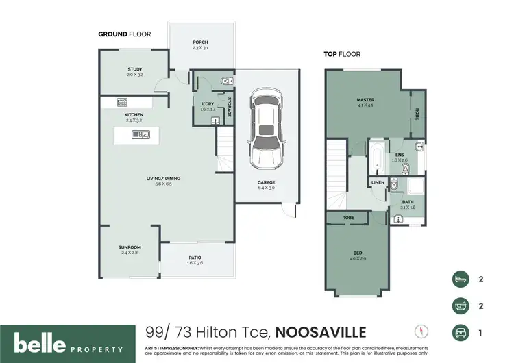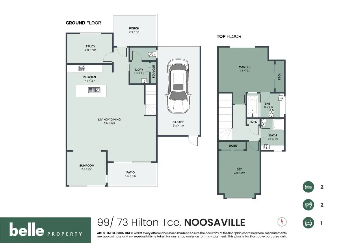 • 2 bedroom plus study, sunroom