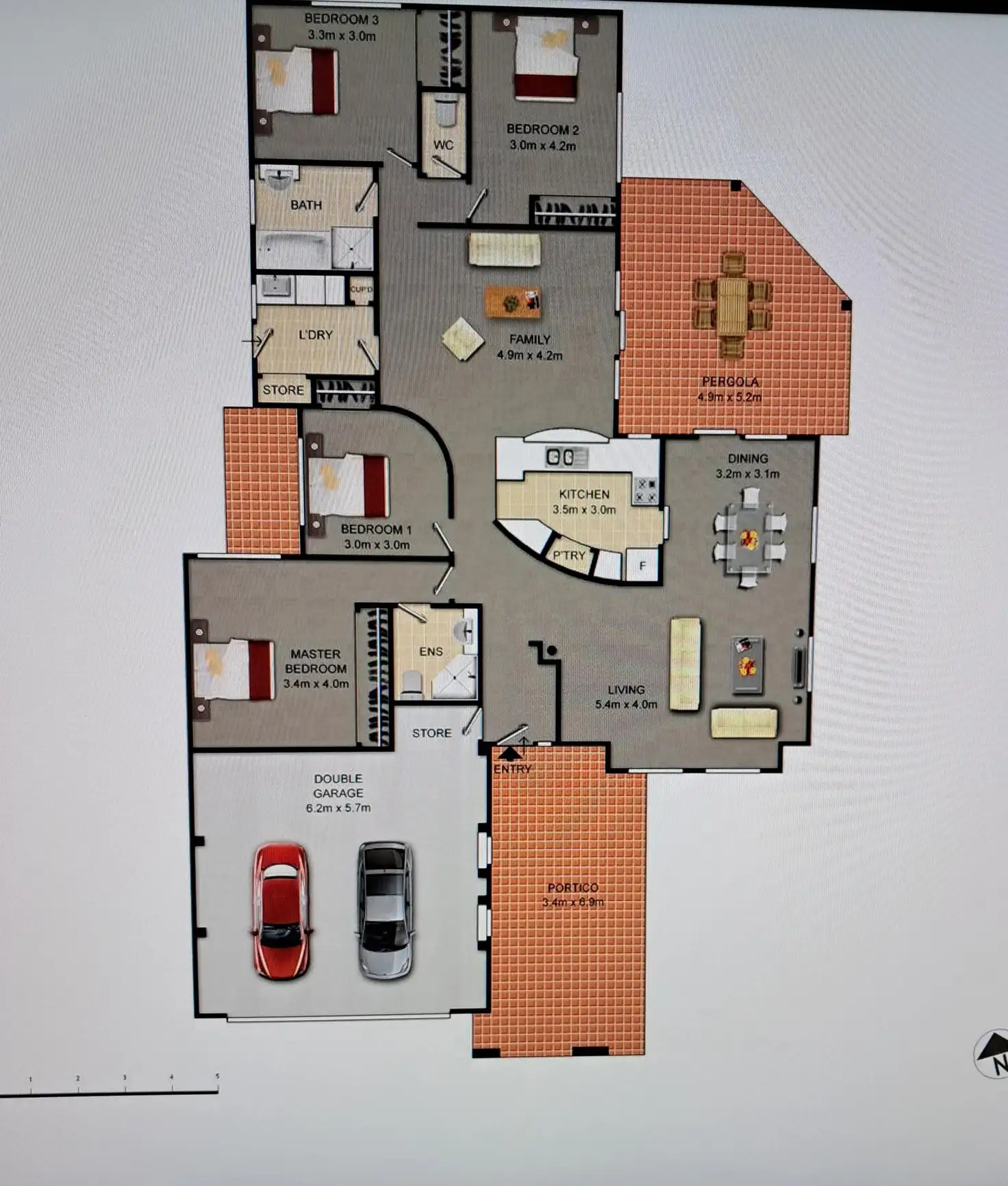 Living size: 156 Sqm. Garage 40 Sqm Pergola: 25.5 Sqm Total 221.5 Sqm