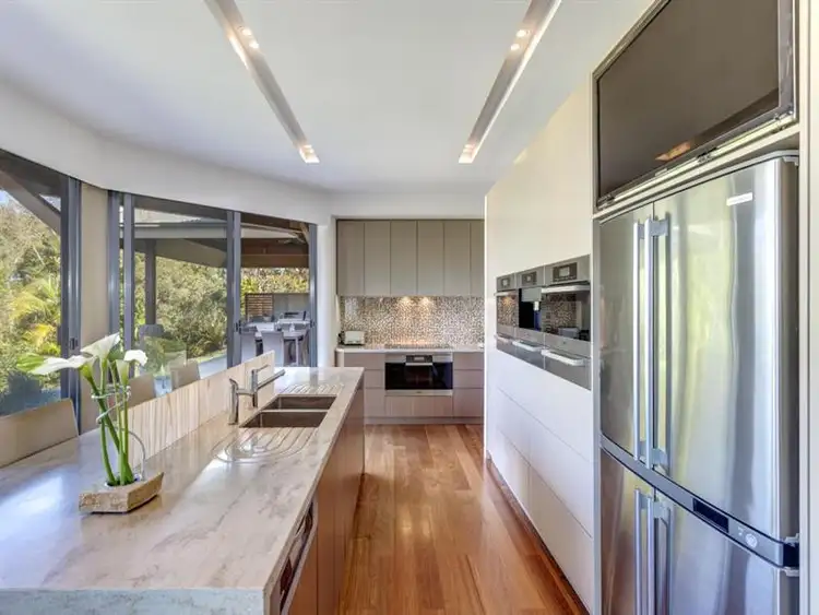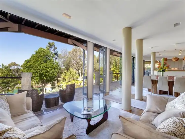 Each of the living rooms feature floor-to-ceiling glass retractable walls opening to the rear verandah and include a formal living room warmed by an open Jetmaster fireplace with sandstone surround, casual living space with defined dining area plus an enormous family entertainment room complete with Caesar Stone wet bar with two glass fronted wine/beer fridges, billiard area with bespoke lighting, built-in tropical aquarium plus heated underflooring. It opens seamlessly to a customised entertainers' pavilion equipped with a Caesar Stone wet bar, built-in barbecue plus pizza oven.