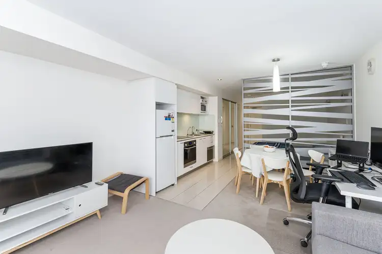 Step inside be greeted by a spacious combined bedroom and living area, thoughtfully separated by with a laser-cut privacy screen. The split system air conditioner will keep you comfortable all year round, and sliding doors lead to a tiled balcony where you can enjoy glimpses of Kings Park, the Narrows Bridge, and Langley Park.