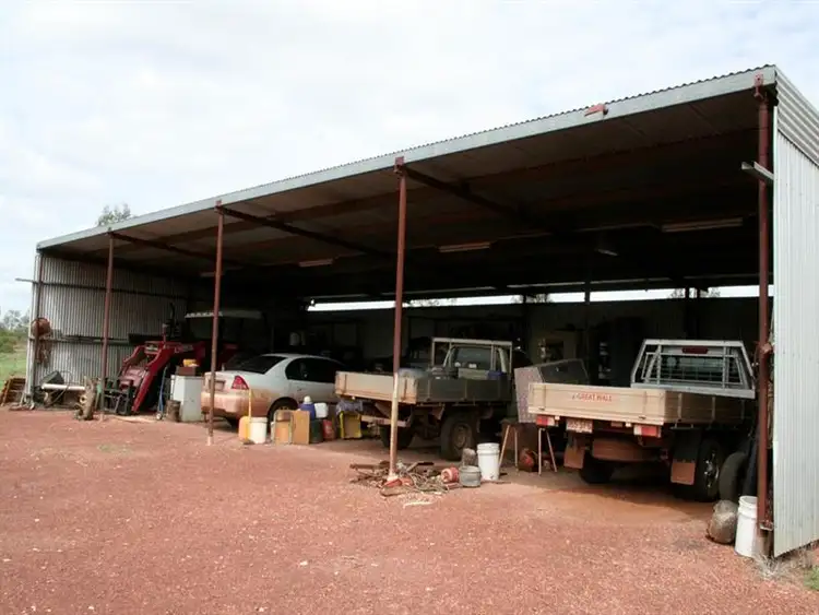 4 bay steel frame workshop with 3 phase power /lights and gravel floor with an open front.